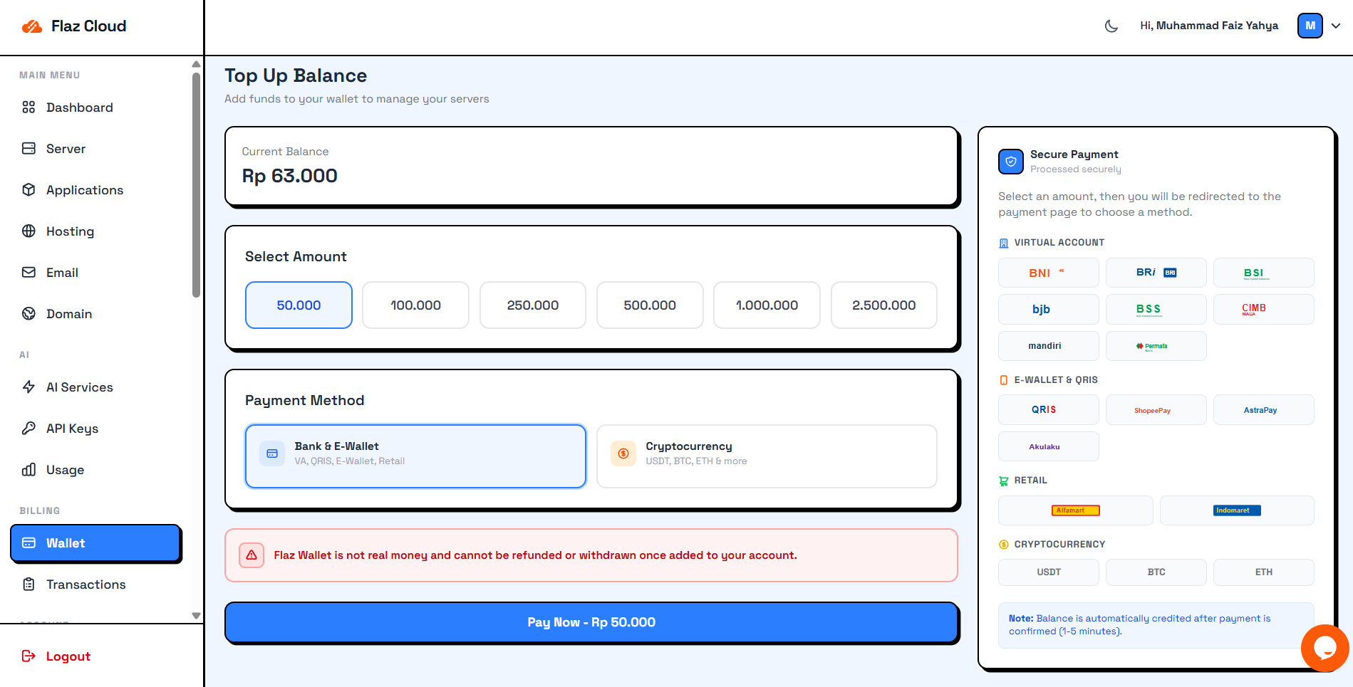 Berikut adalah panduan lengkap untuk mengisi saldo atau top up wallet di Flaz Cloud agar Anda bisa mengelola server dengan lebih lancar.