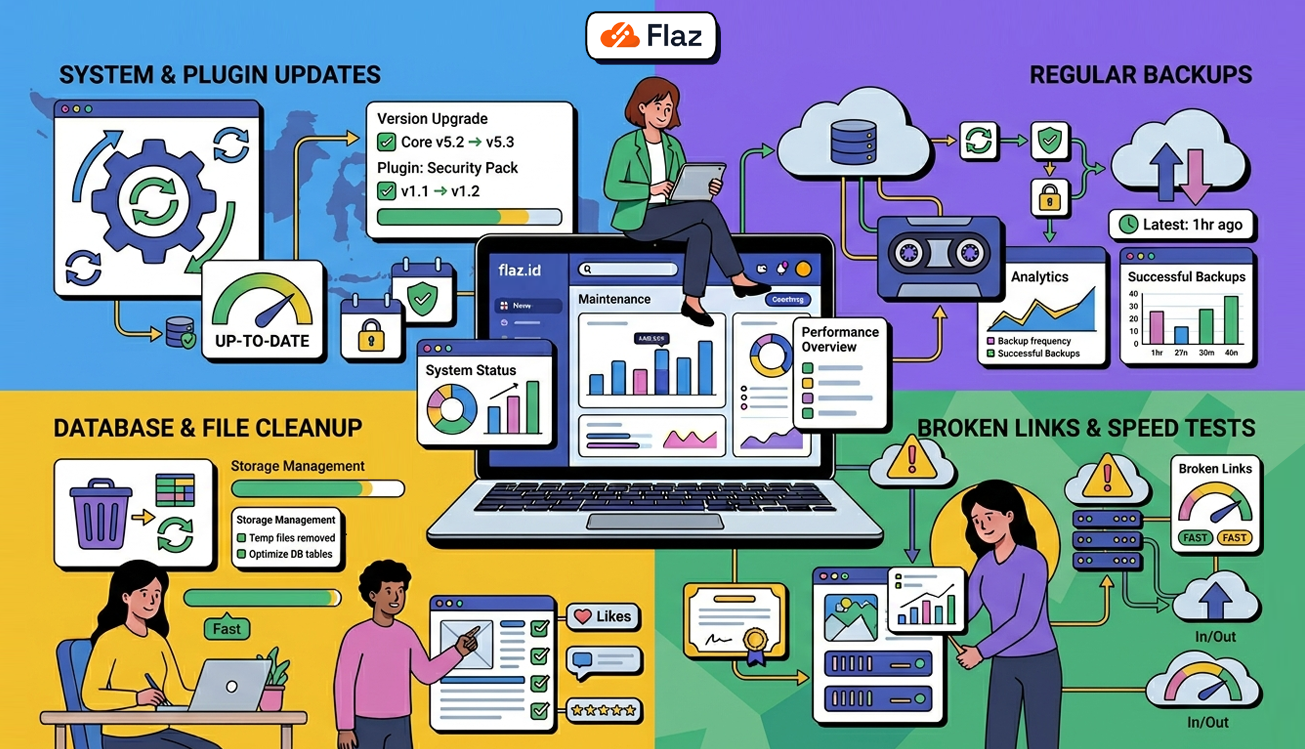 Flaz.id hadir sebagai Fast & Secure Cloud Provider yang sangat peduli pada keberlangsungan aset digital teman-teman. Semua yang teman-teman perlukan untuk merawat dan menjalankan website tersedia di Flaz, didukung dengan server teknologi terbaru dan jaminan backup yang handal. Dengan infrastruktur yang berkualitas, proses perawatan website teman-teman akan terasa lebih ringan, praktis, dan pastinya aman. Sebelum masuk ke detail teknis perawatan, sangat utama bagi teman-teman untuk memahami kembali Apa Itu Layanan Hosting? sebagai rumah utama bagi semua file website Anda.